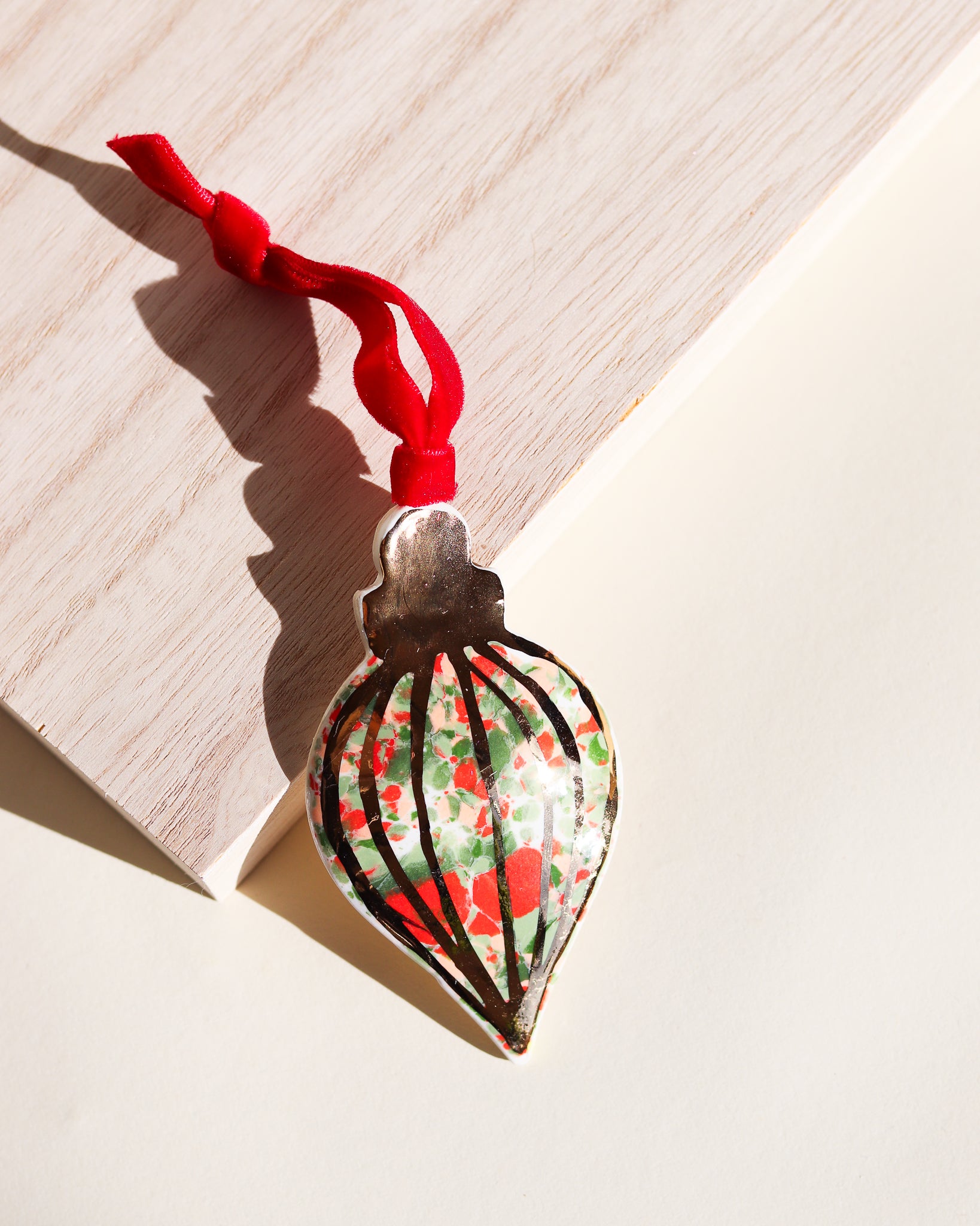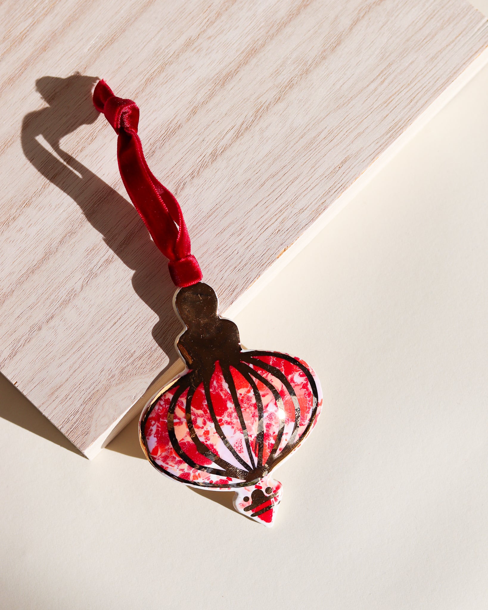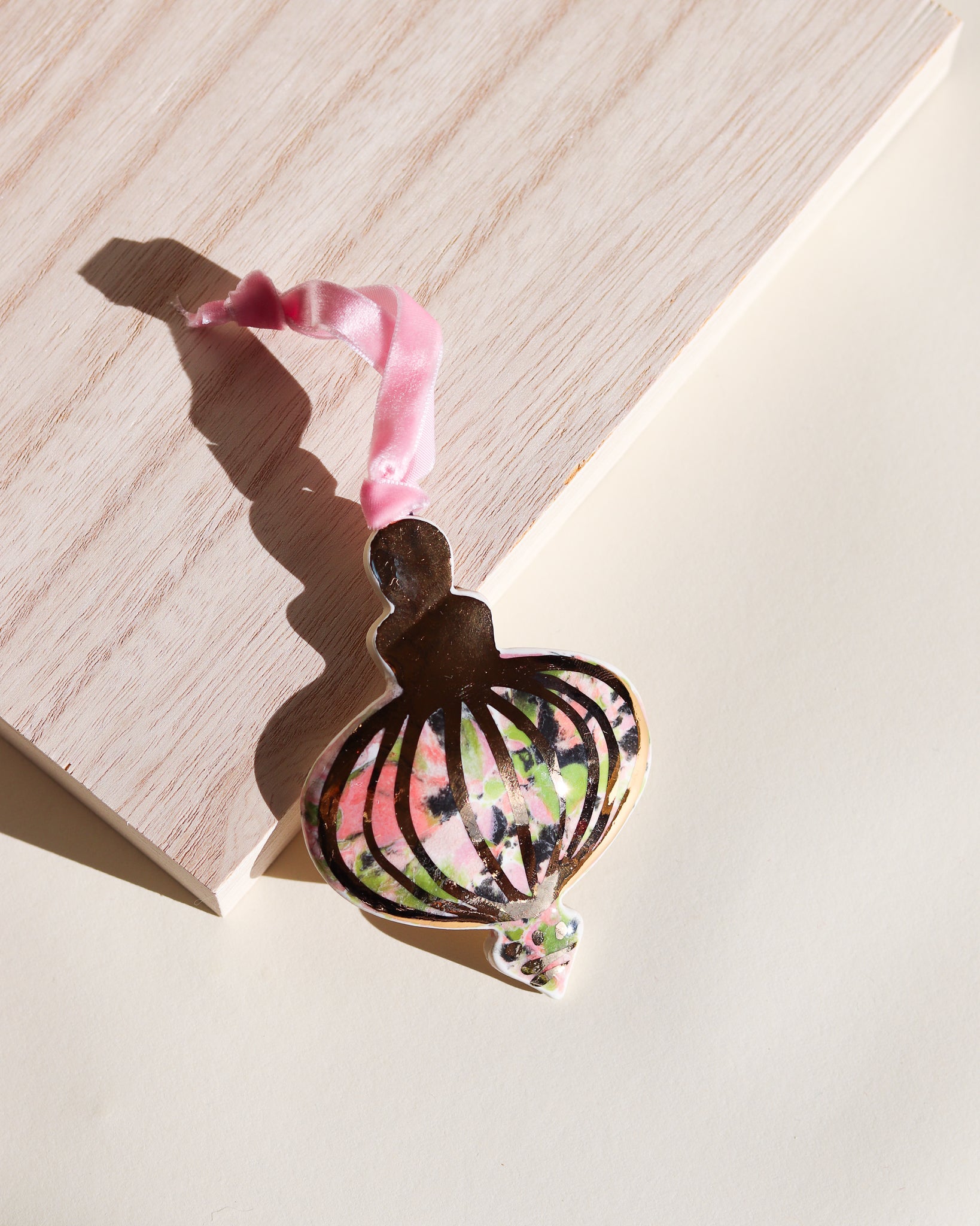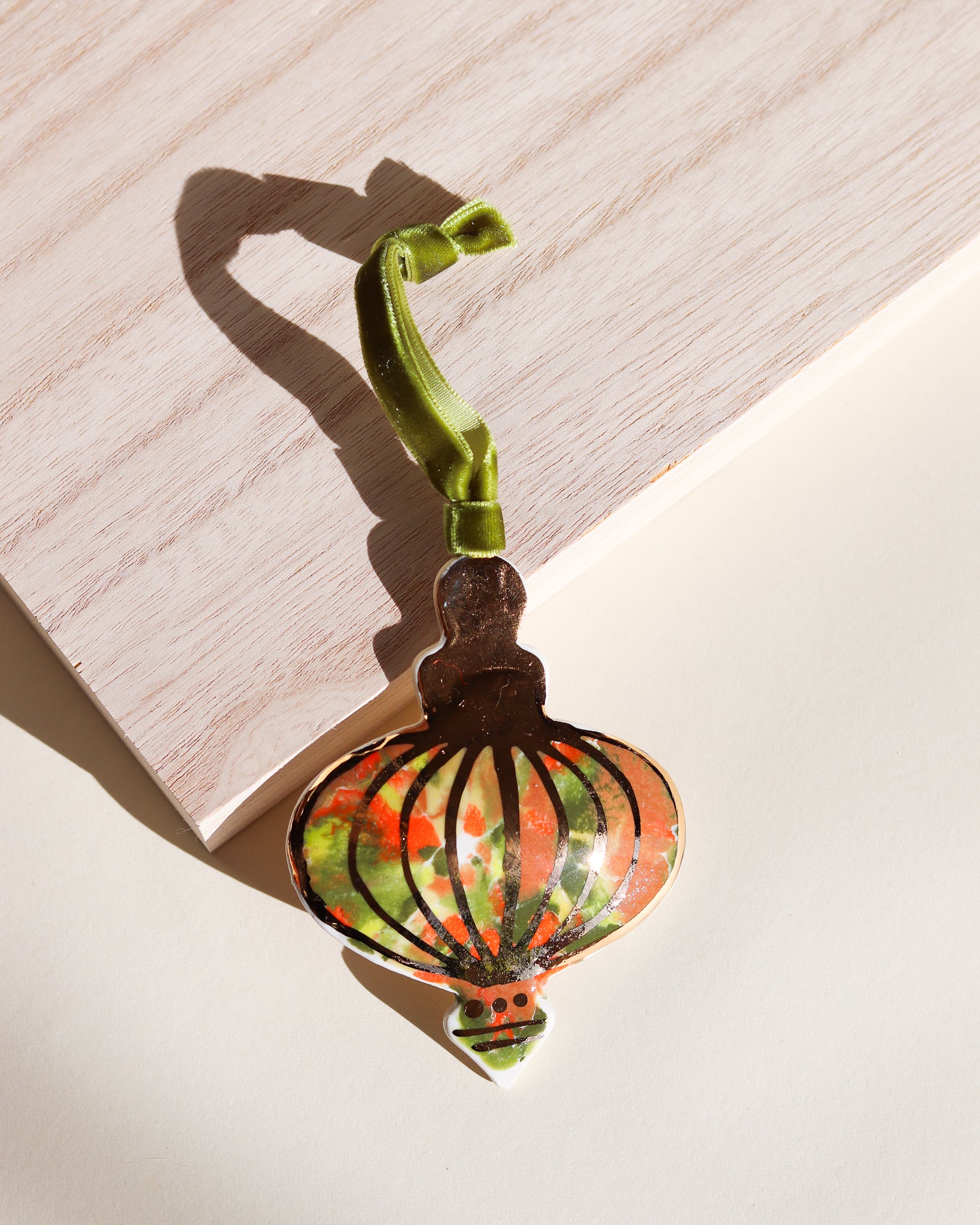 Drift & Bloom patterns on a curved ornament featuring 22k gold line work. These photos don't do the gold justice, in person they have a bright shine that would reflect the lights of a Christmas tree beautifully.