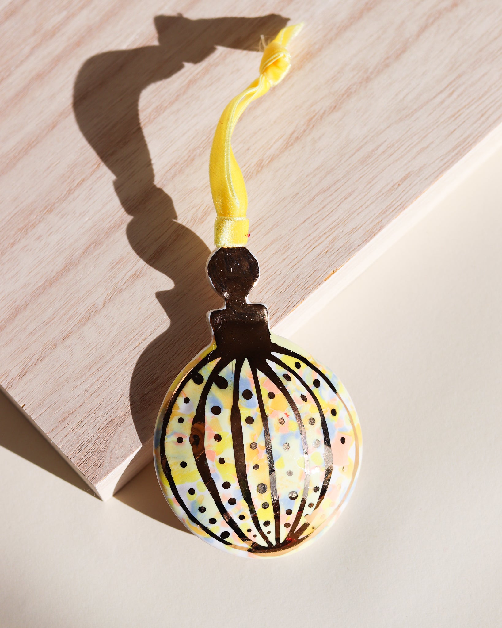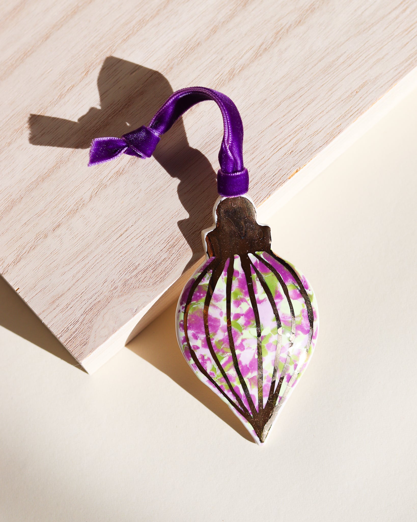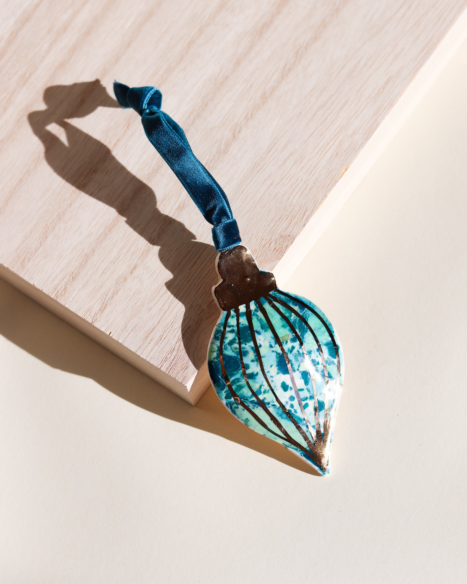 Drift & Bloom patterns on a curved ornament featuring 22k gold line work. These photos don't do the gold justice, in person they have a bright shine that would reflect the lights of a Christmas tree beautifully.