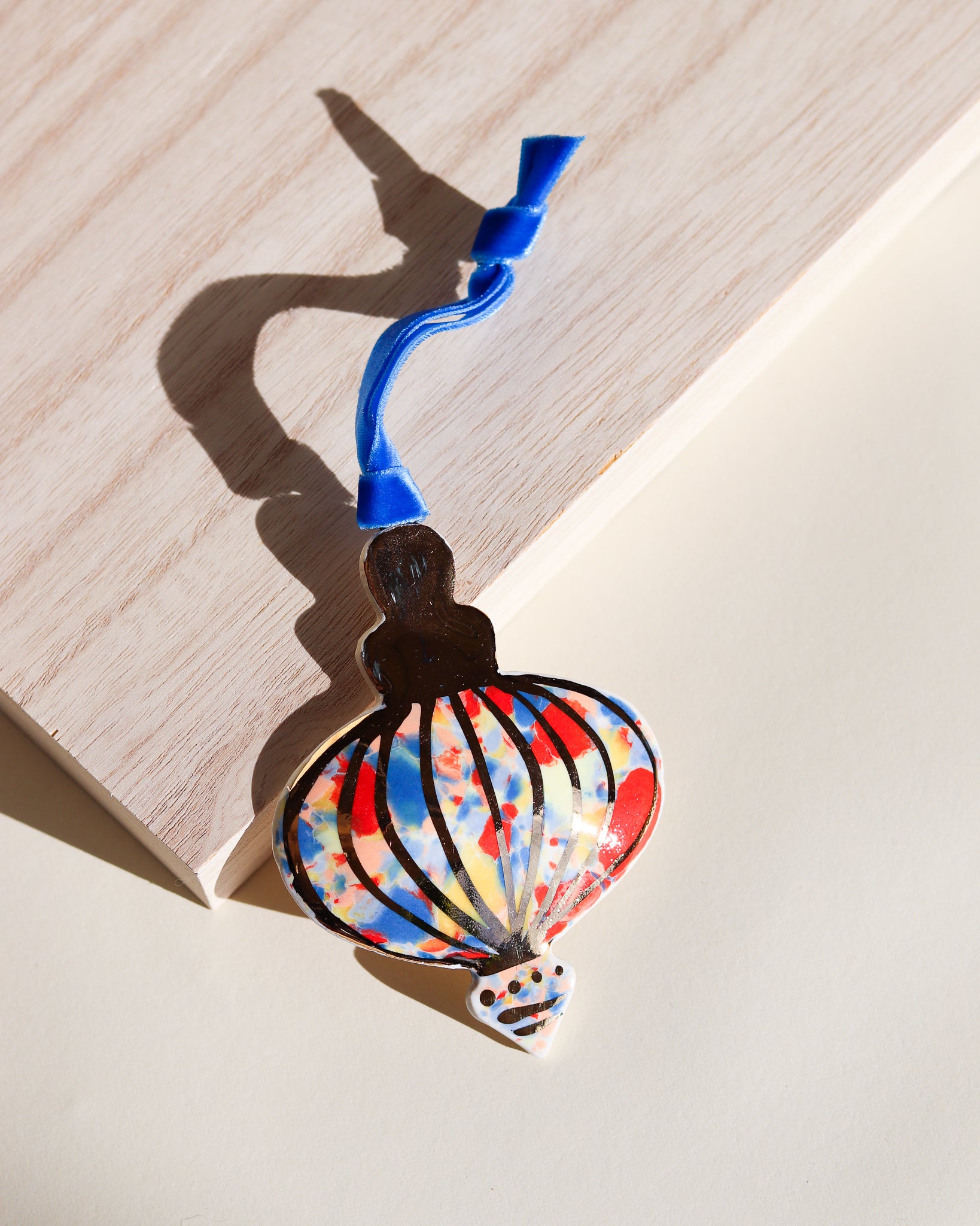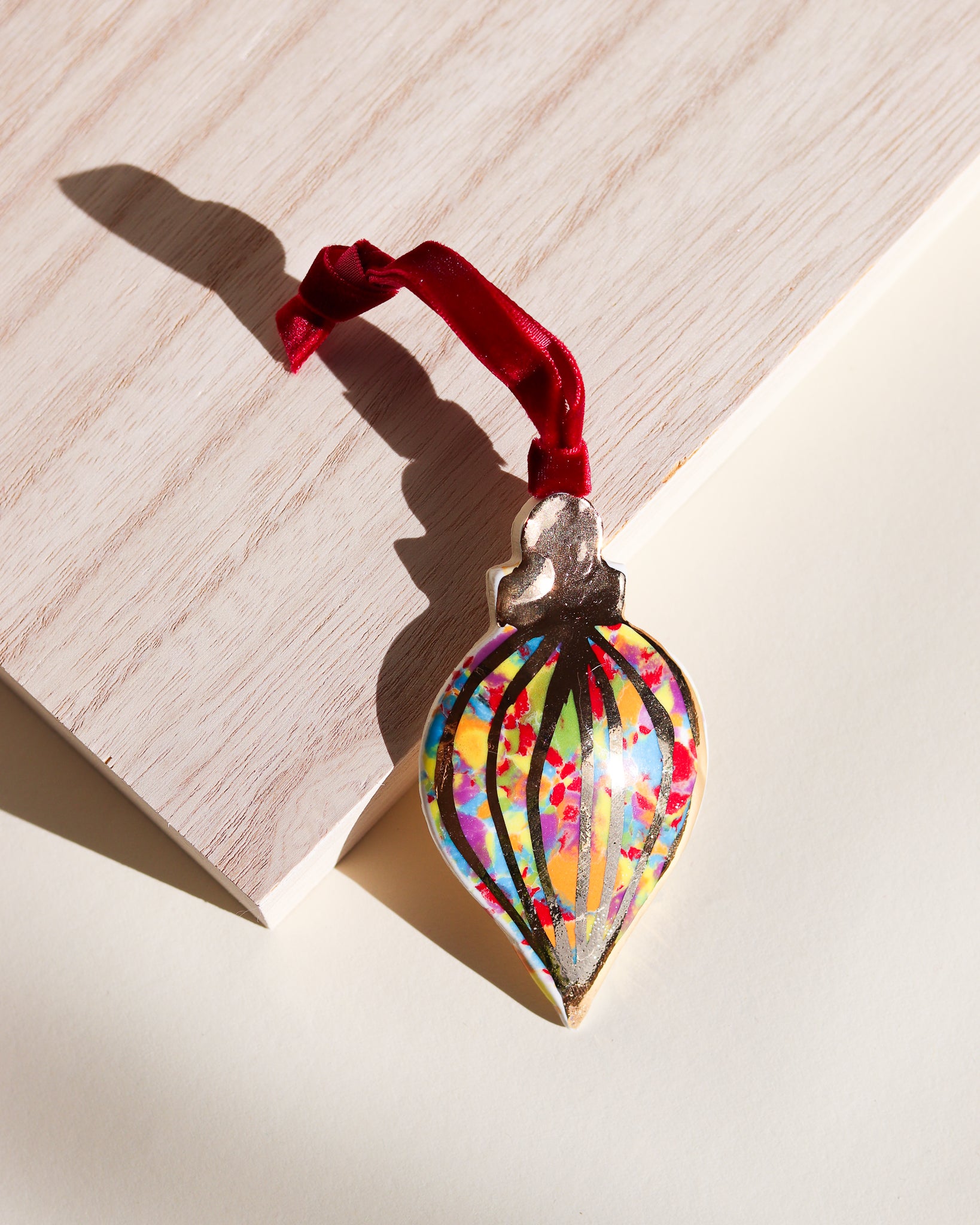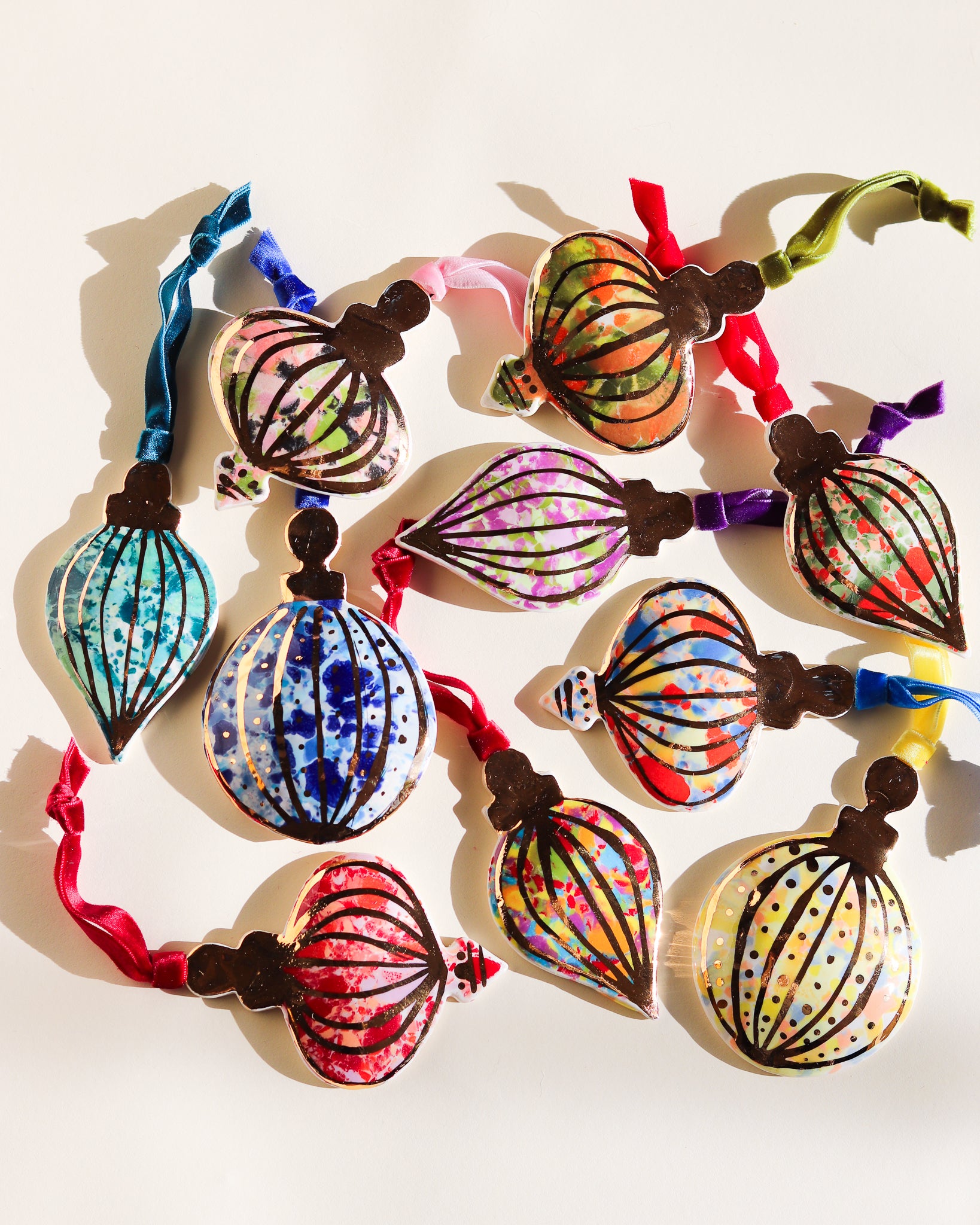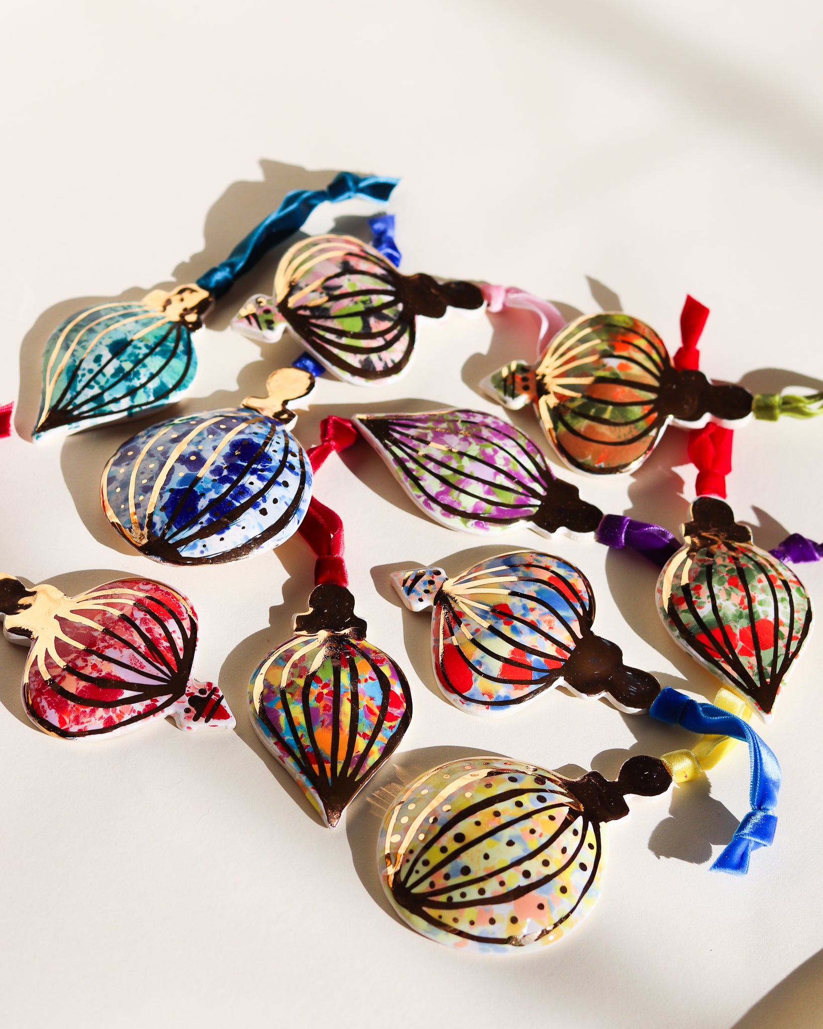 Drift & Bloom patterns on a curved ornament featuring 22k gold line work. These photos don't do the gold justice, in person they have a bright shine that would reflect the lights of a Christmas tree beautifully.