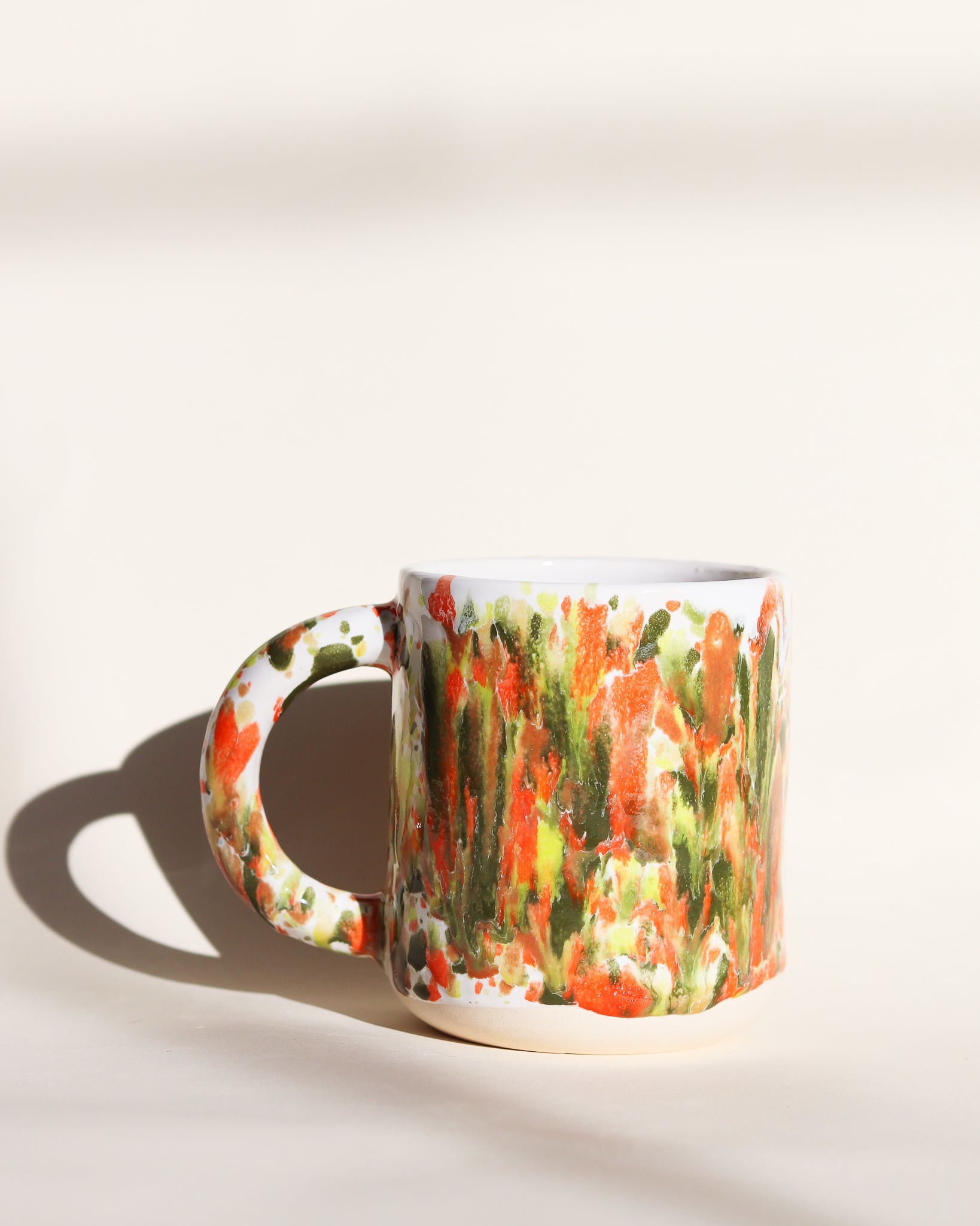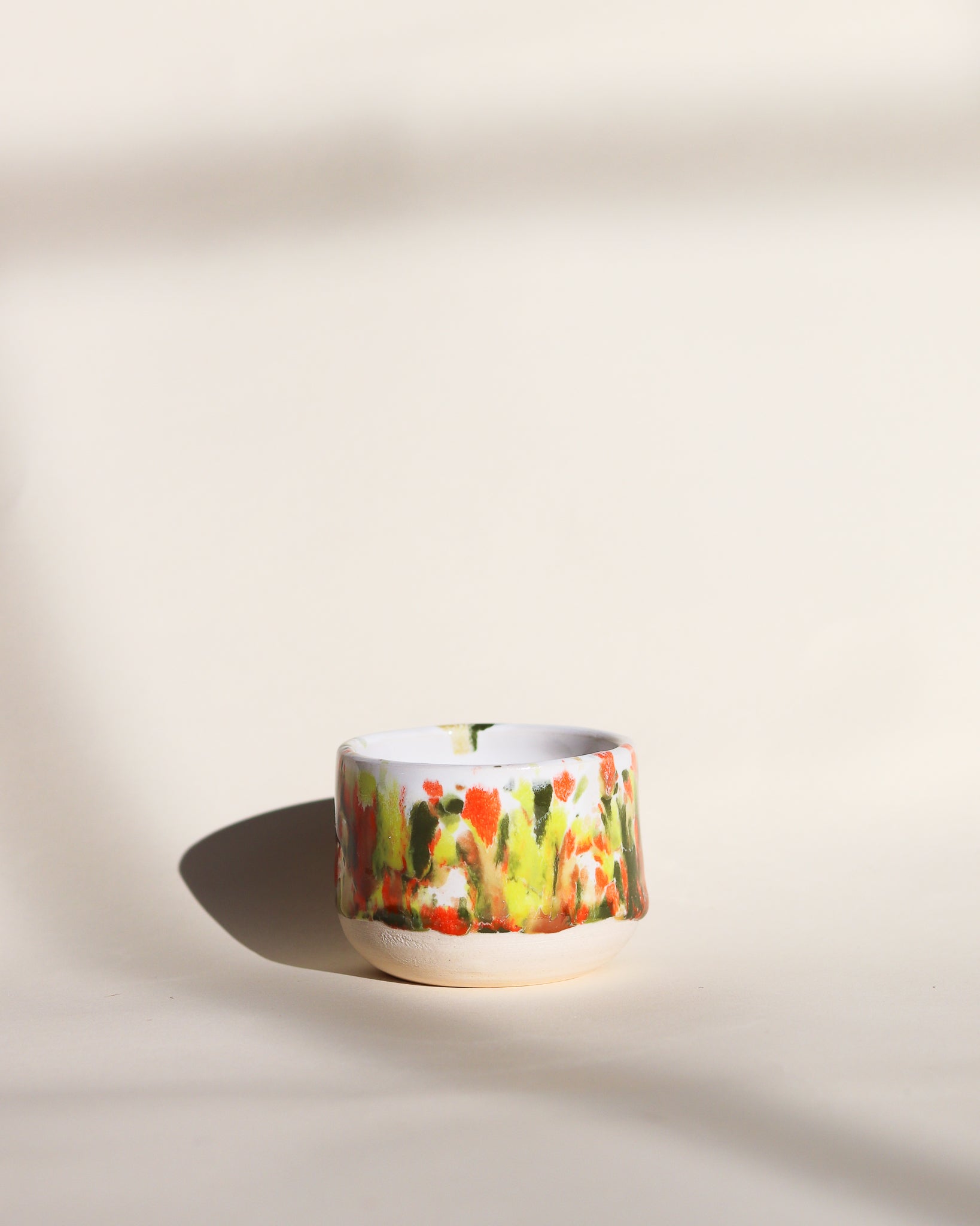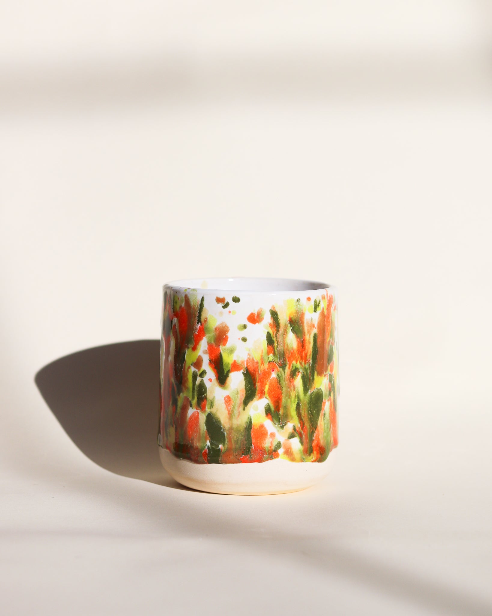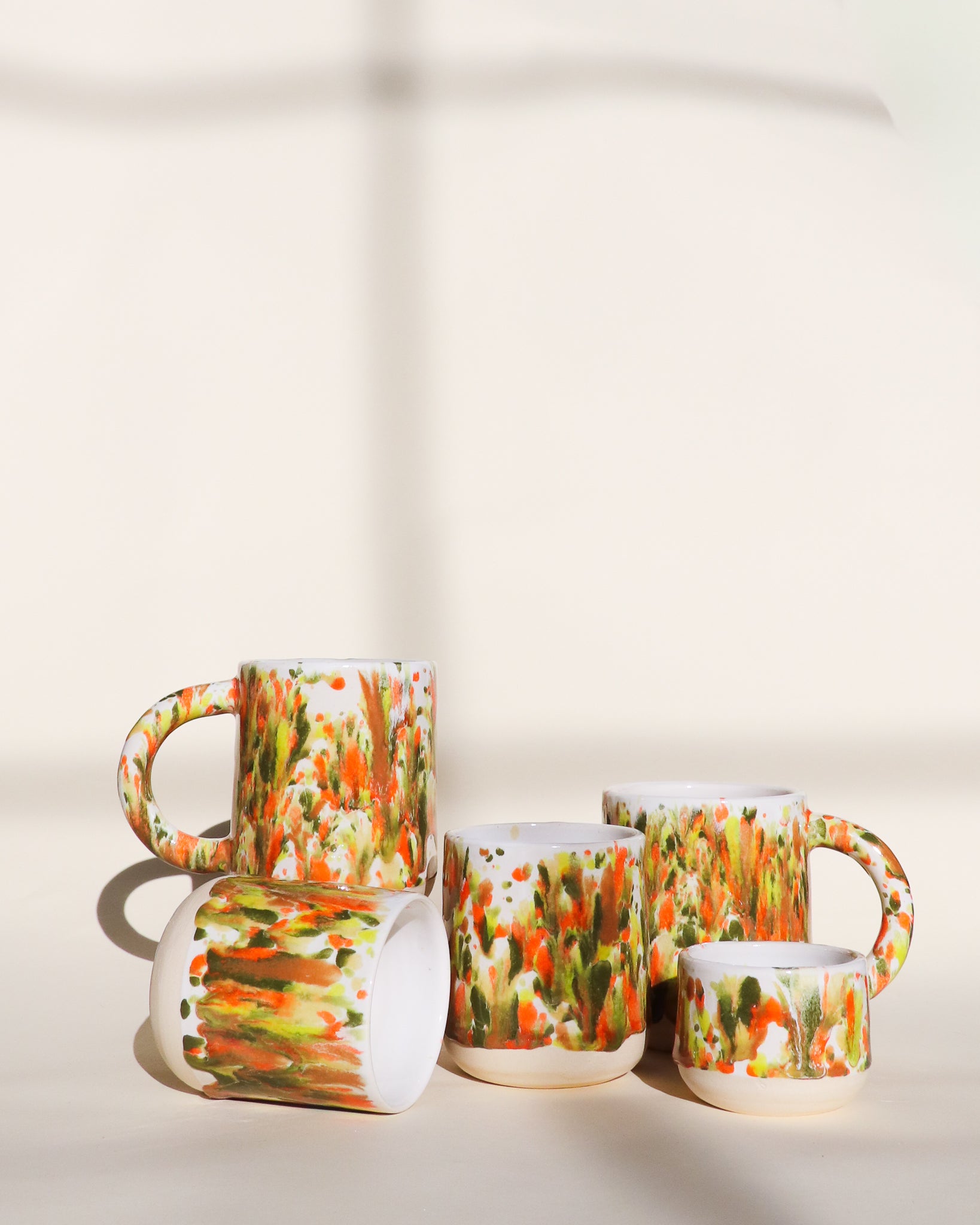 The Drift & Bloom collection is inspired by my love for all things the color. This color way was inspired by Mid Century Modern colors. All pieces are fully glazed cream stoneware, available in espresso cups, tumblers, and mugs.