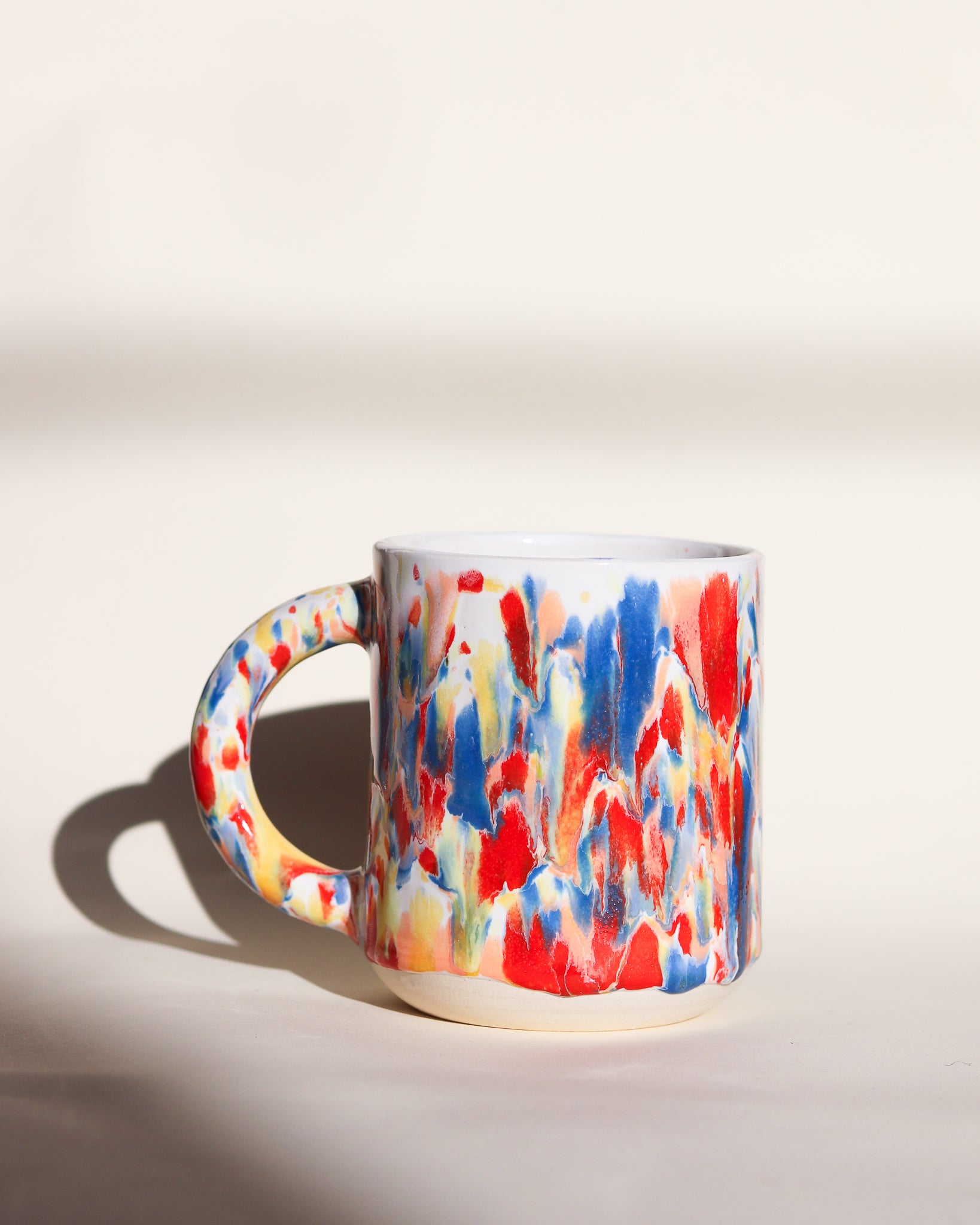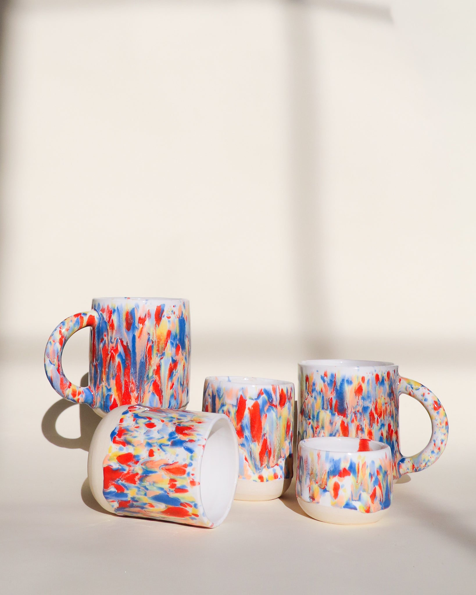 The Drift & Bloom collection is inspired by my love for all things the color. This colorway was inspired by primary colors, red, yellow, & blue. All pieces are fully glazed cream stoneware, available in espresso cups, tumblers, and mugs.
