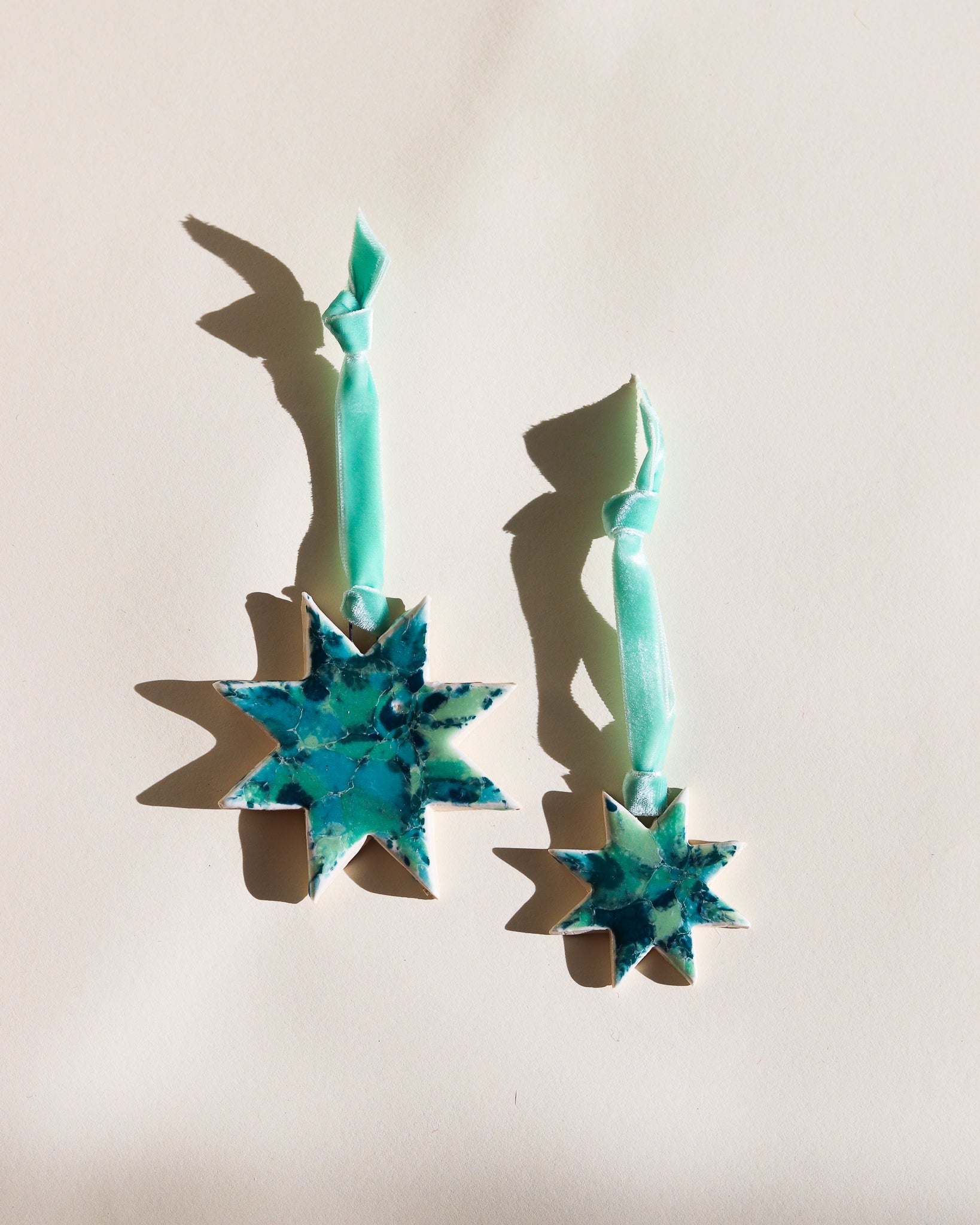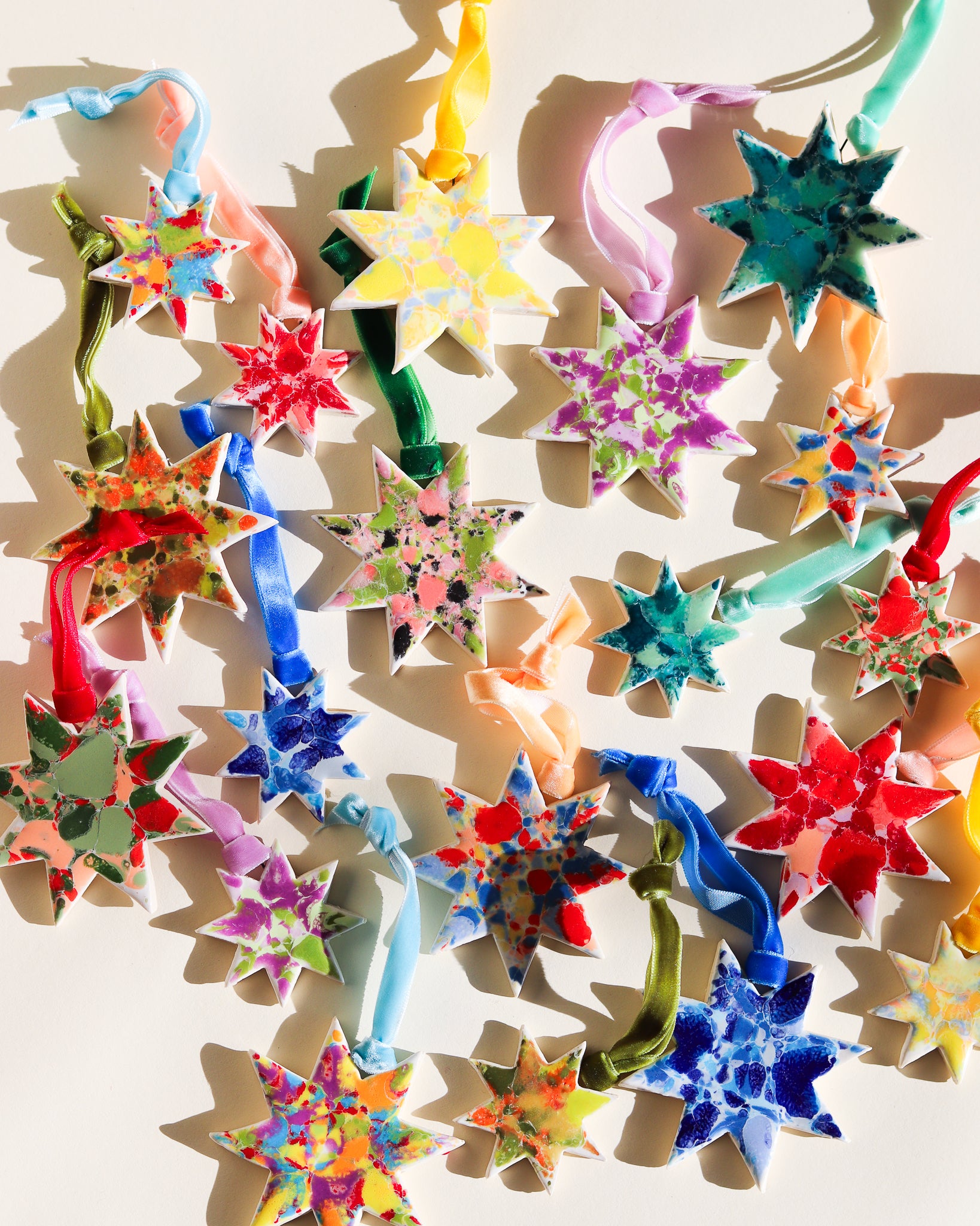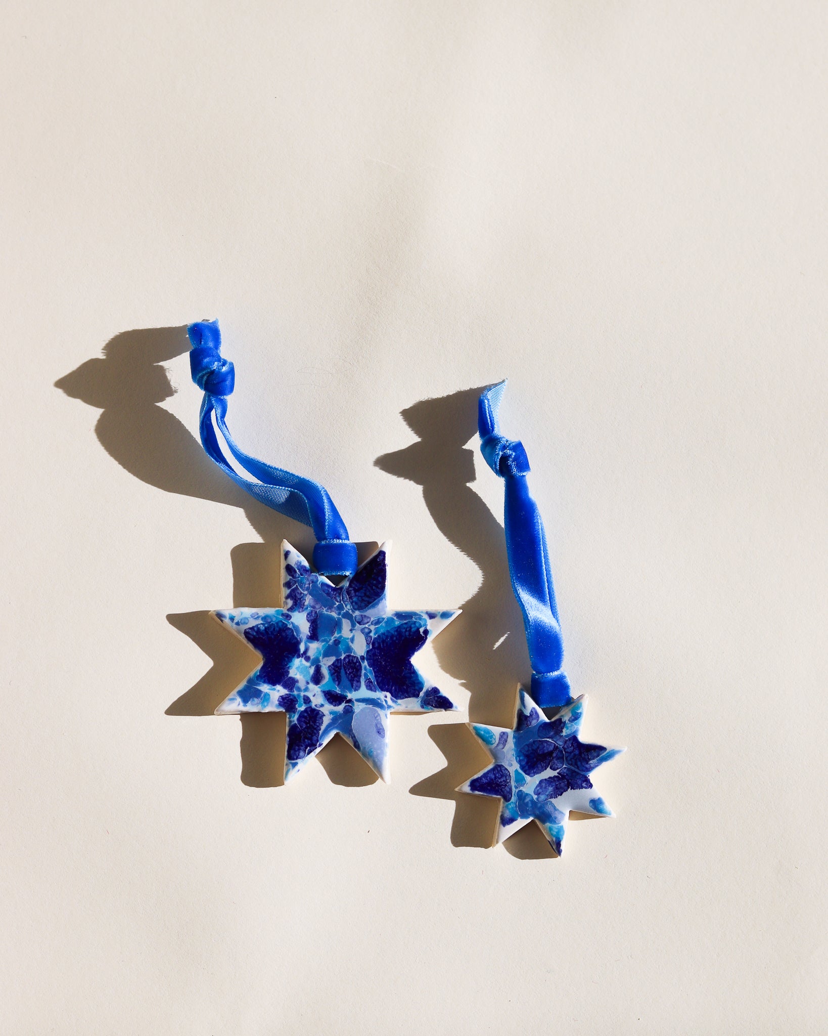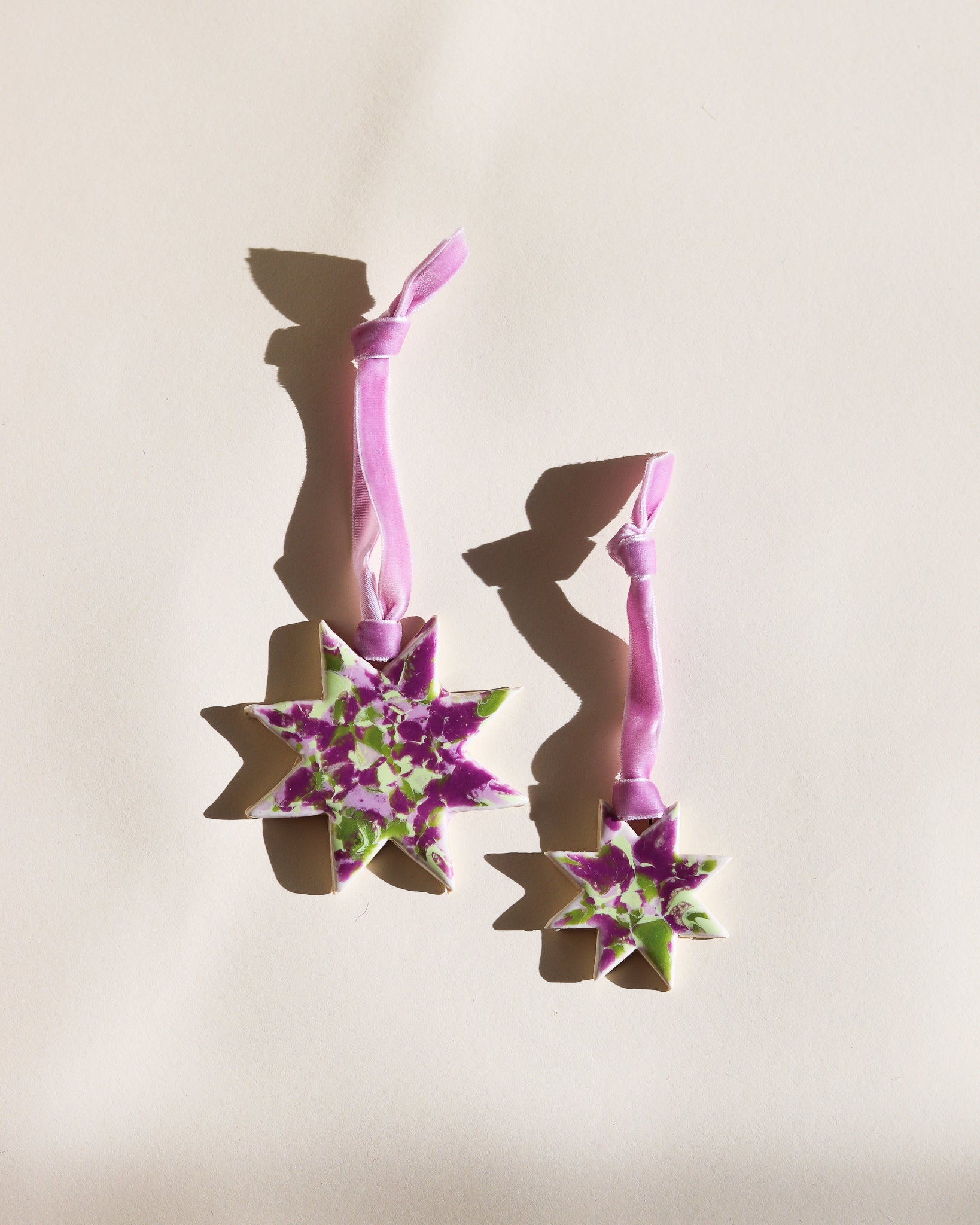 Drift & Bloom patterns on sm and lg stars with velvet ribbon (all ribbons match colors of ornaments but may be different from what is captured in the photo)