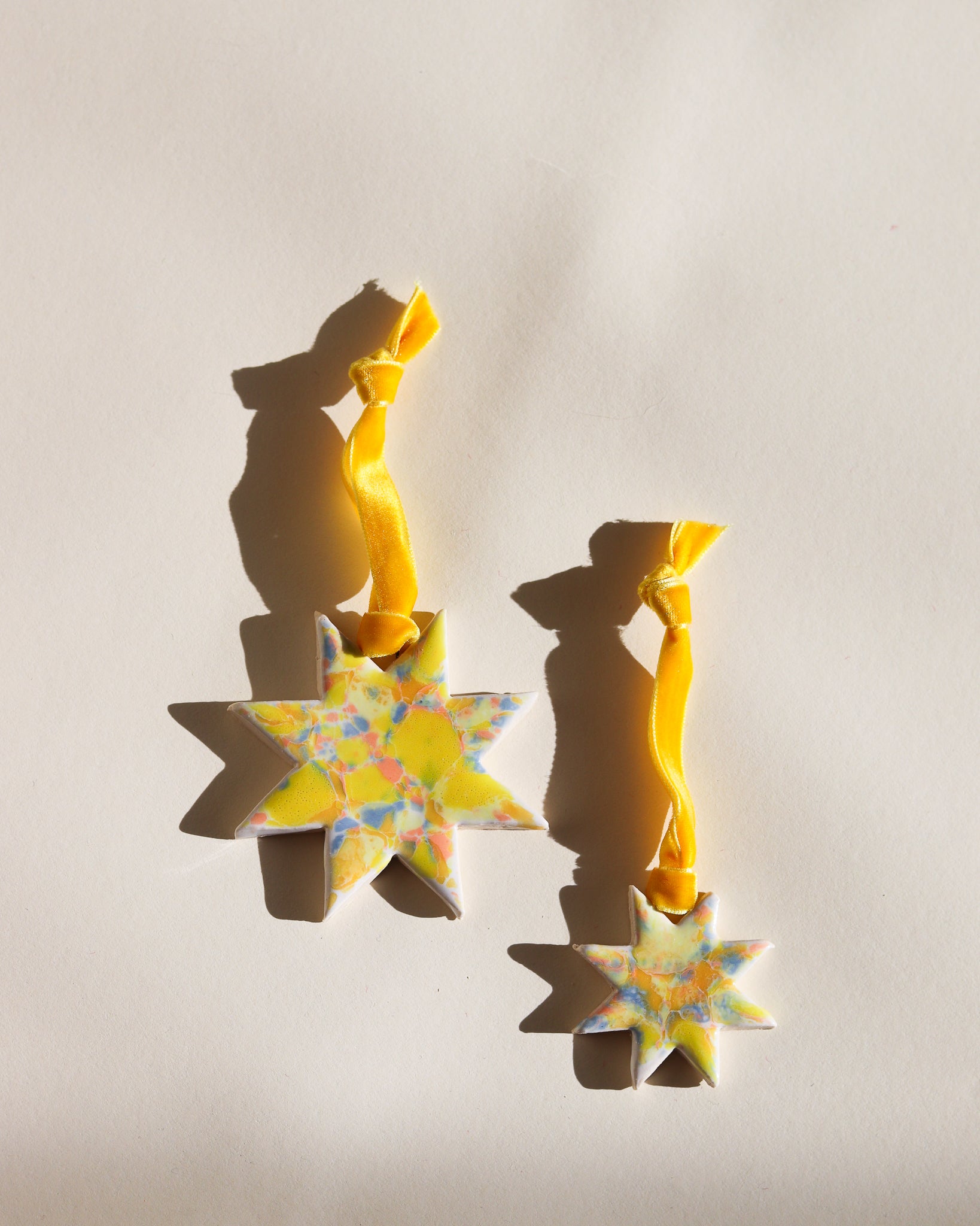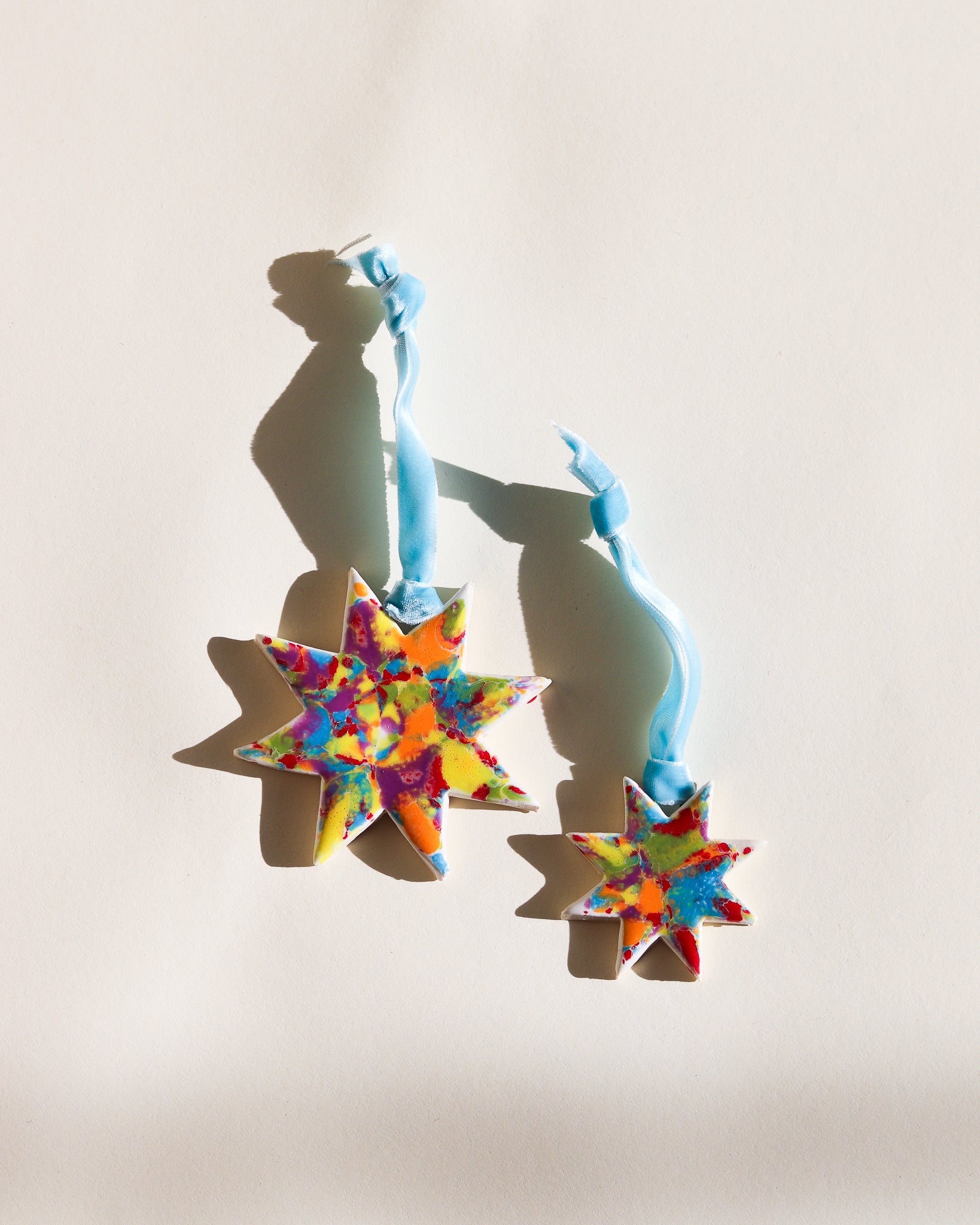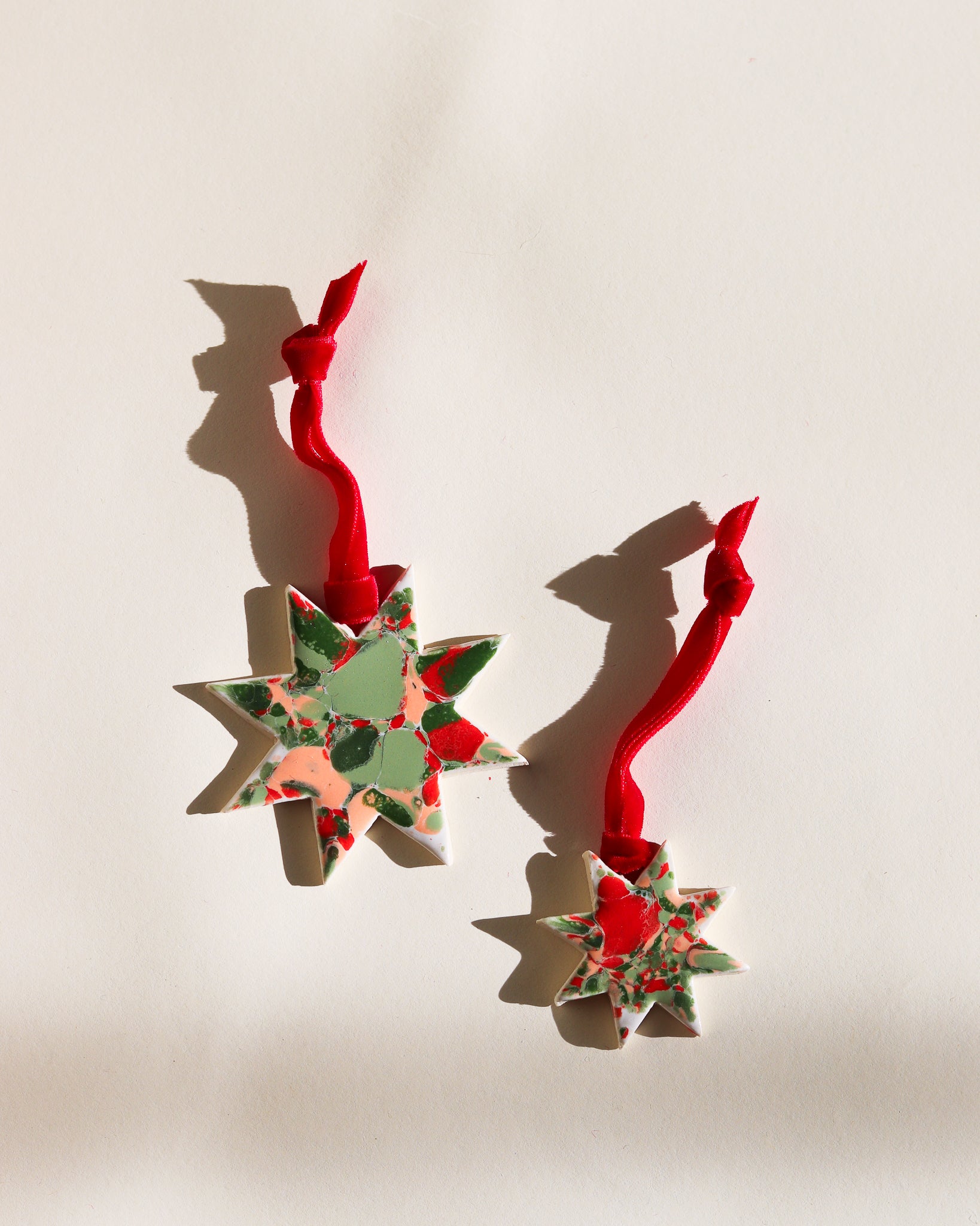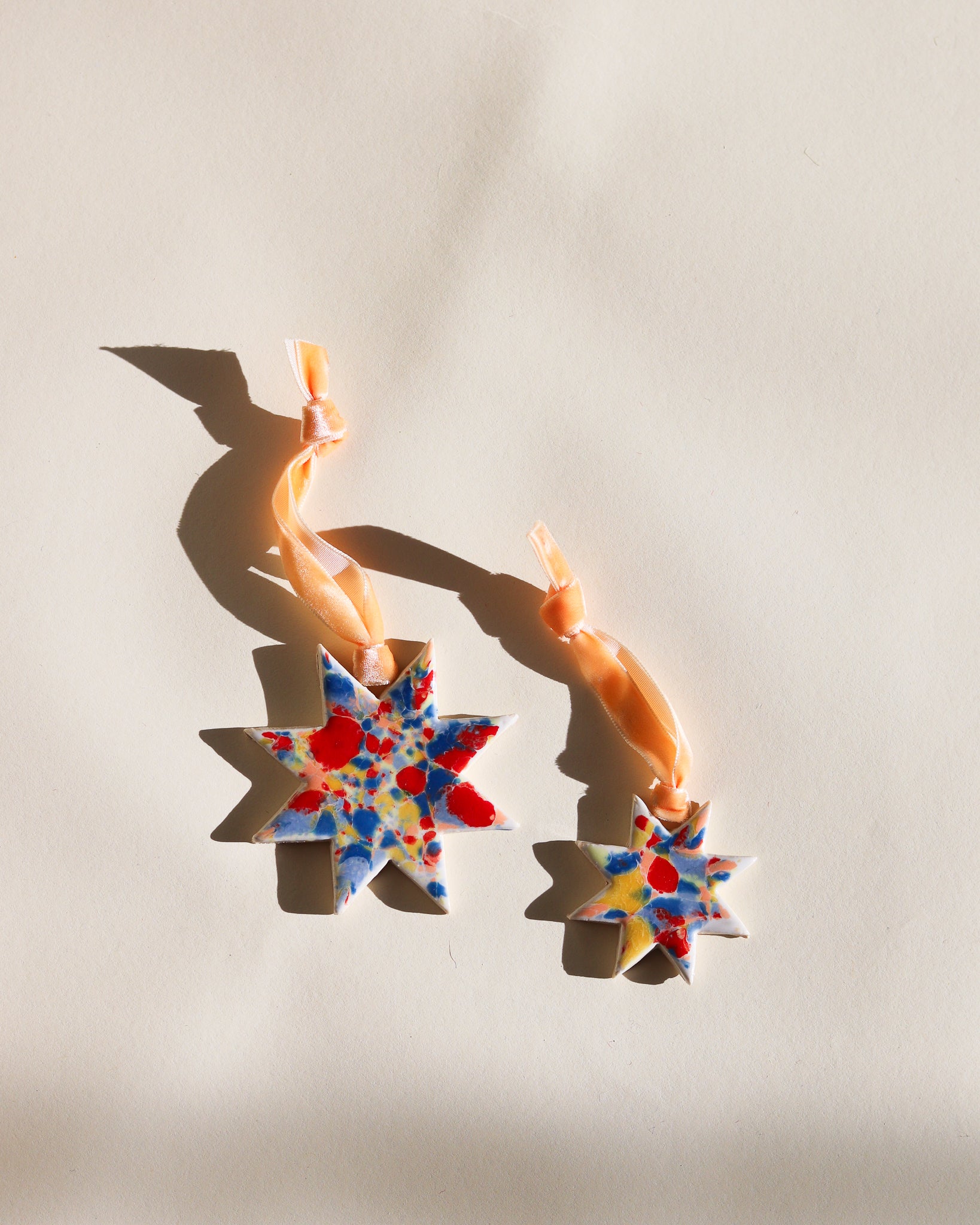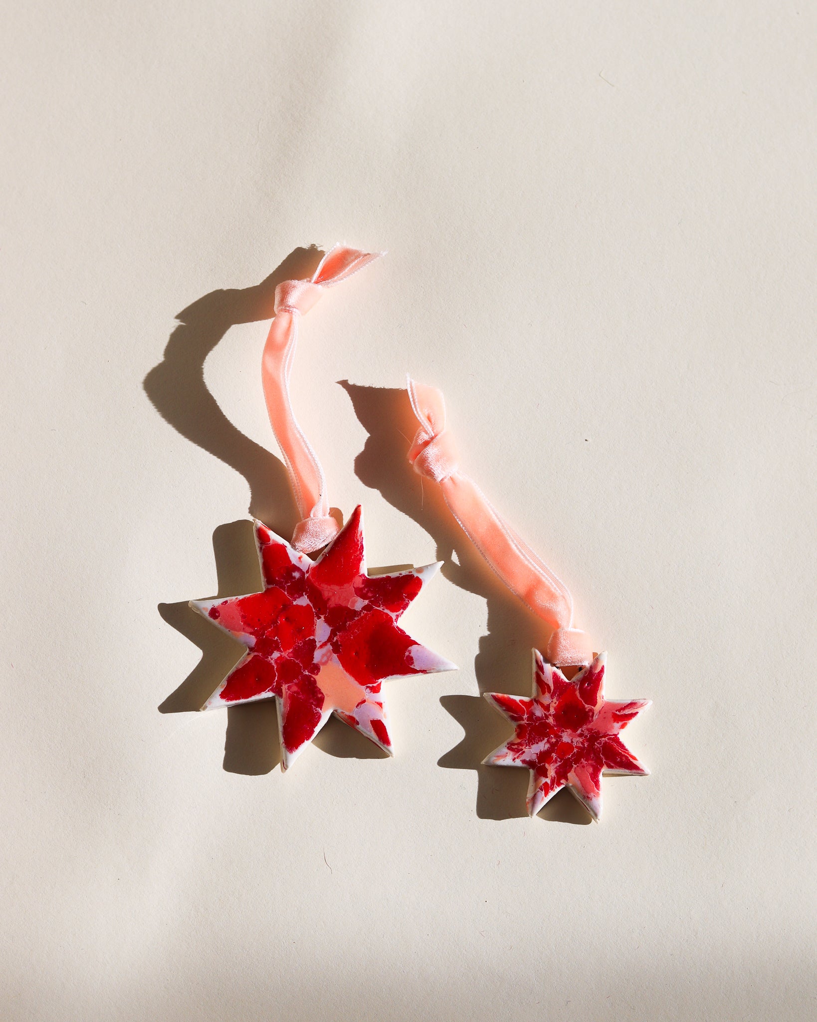 Drift & Bloom patterns on sm and lg stars with velvet ribbon (all ribbons match colors of ornaments but may be different from what is captured in the photo)